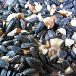 Winter finches eat mostly seeds and grain, and they require great quantities of nutritious food to keep up their body heat and energy in the bitter cold. Black oil sunflower seed is ideal for most winter finches, even in southern areas. While their sturdy bills can break open these seeds, hulled sunflower seed is often preferred because there will be no discarded shells to build up under the feeder until the ground can be cleaned in the spring. Offering this seed in open platform feeders will accommodate large, hungry flocks, but hopper or tube feeders with covers will protect the seed better from snow, ice and winter rains that can cause mold.